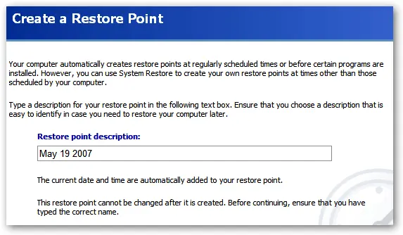 Click on “Create a restore point” and then click the Next button. You’ll be brought to a screen where you can type in a description for your restore point. Use something memorable if possible.