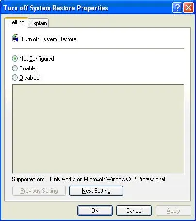 9. On the Setting tab, select Disable (this will disable turn off system restore, it mean’s that system restore would be enable), and then click Apply and OK.